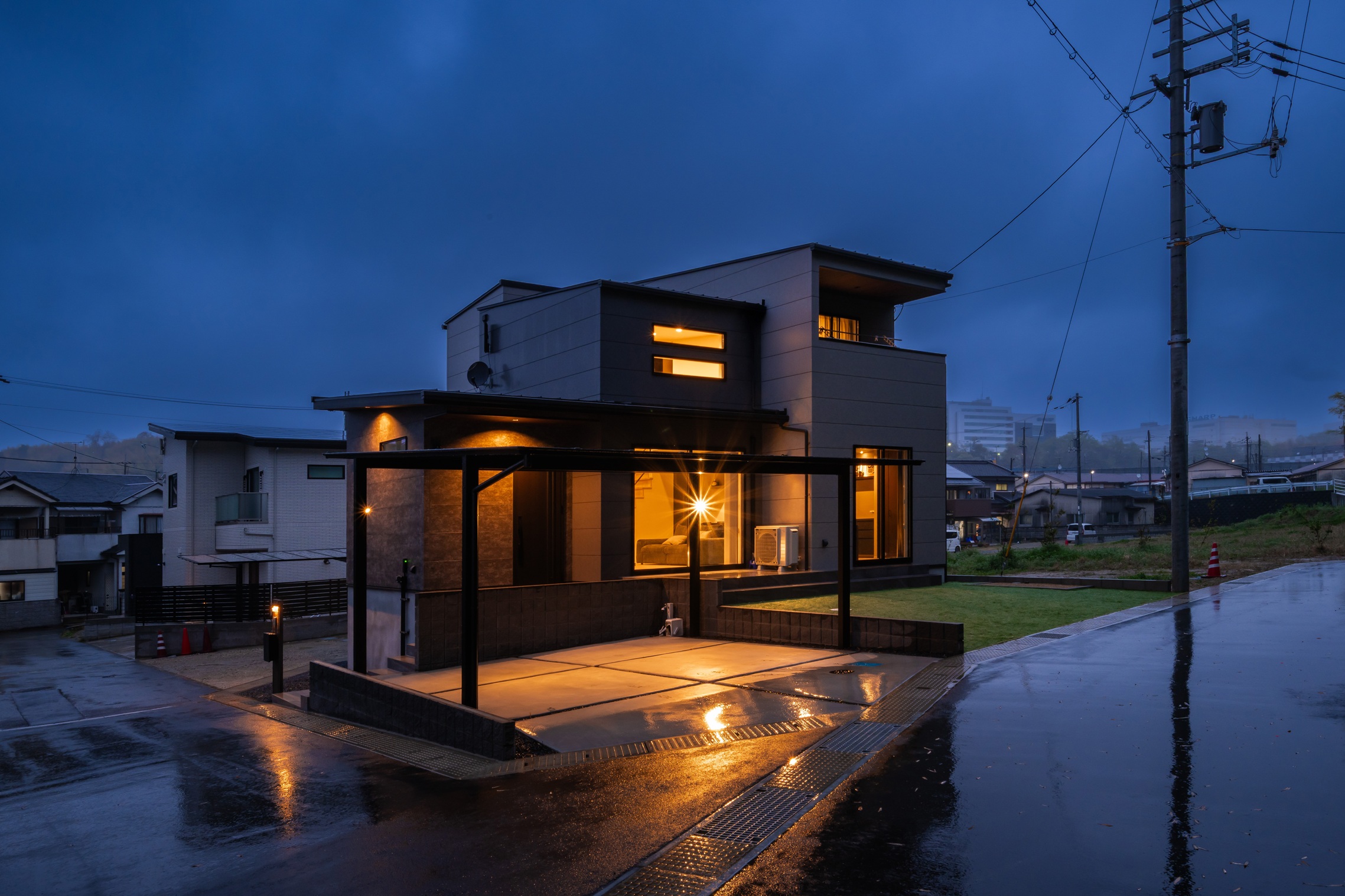 玄関までのアプローチに階段を設け、駐車場は複雑な勾配で高低差を調整するなど、随所に工夫を凝らしました。
